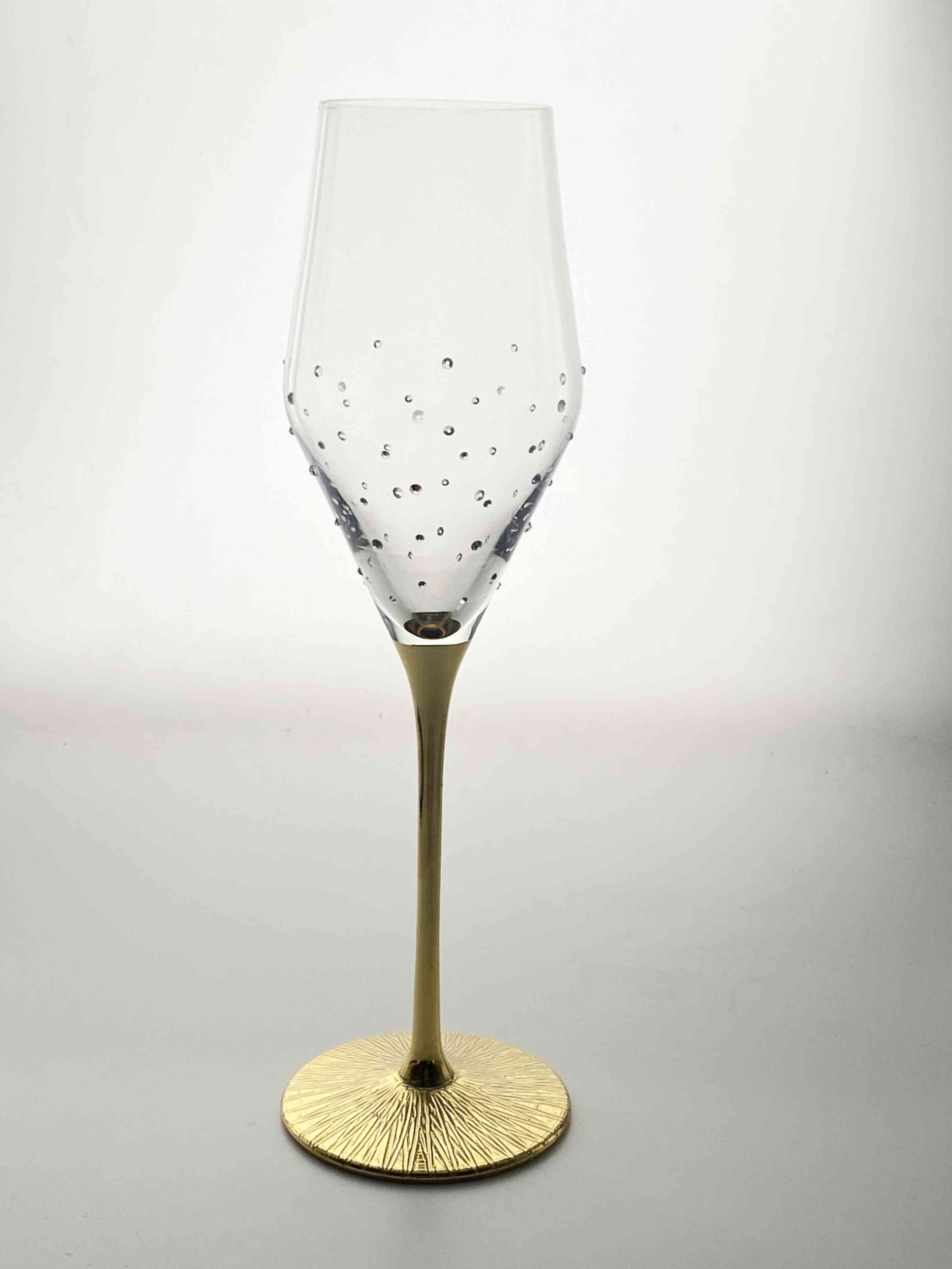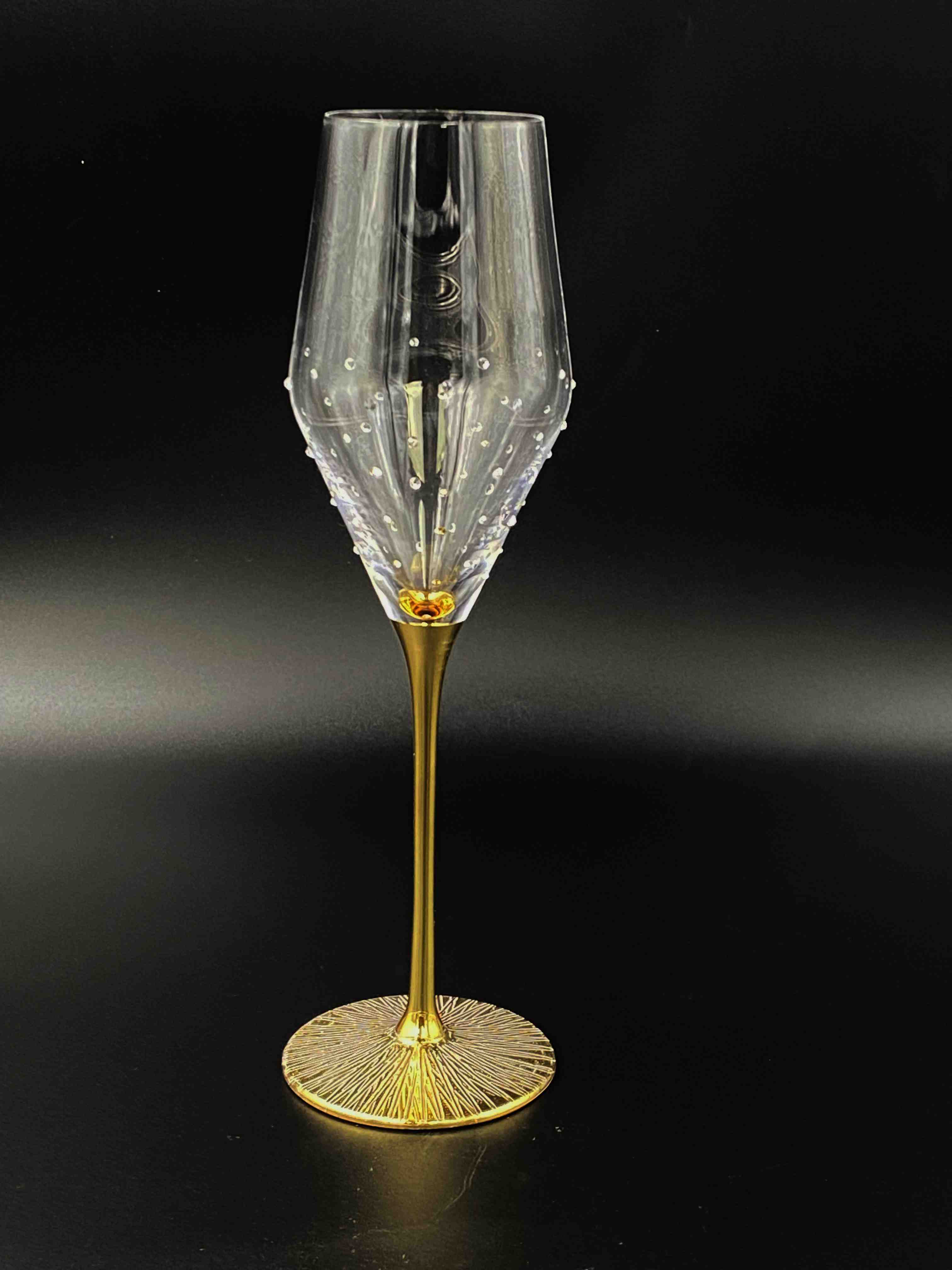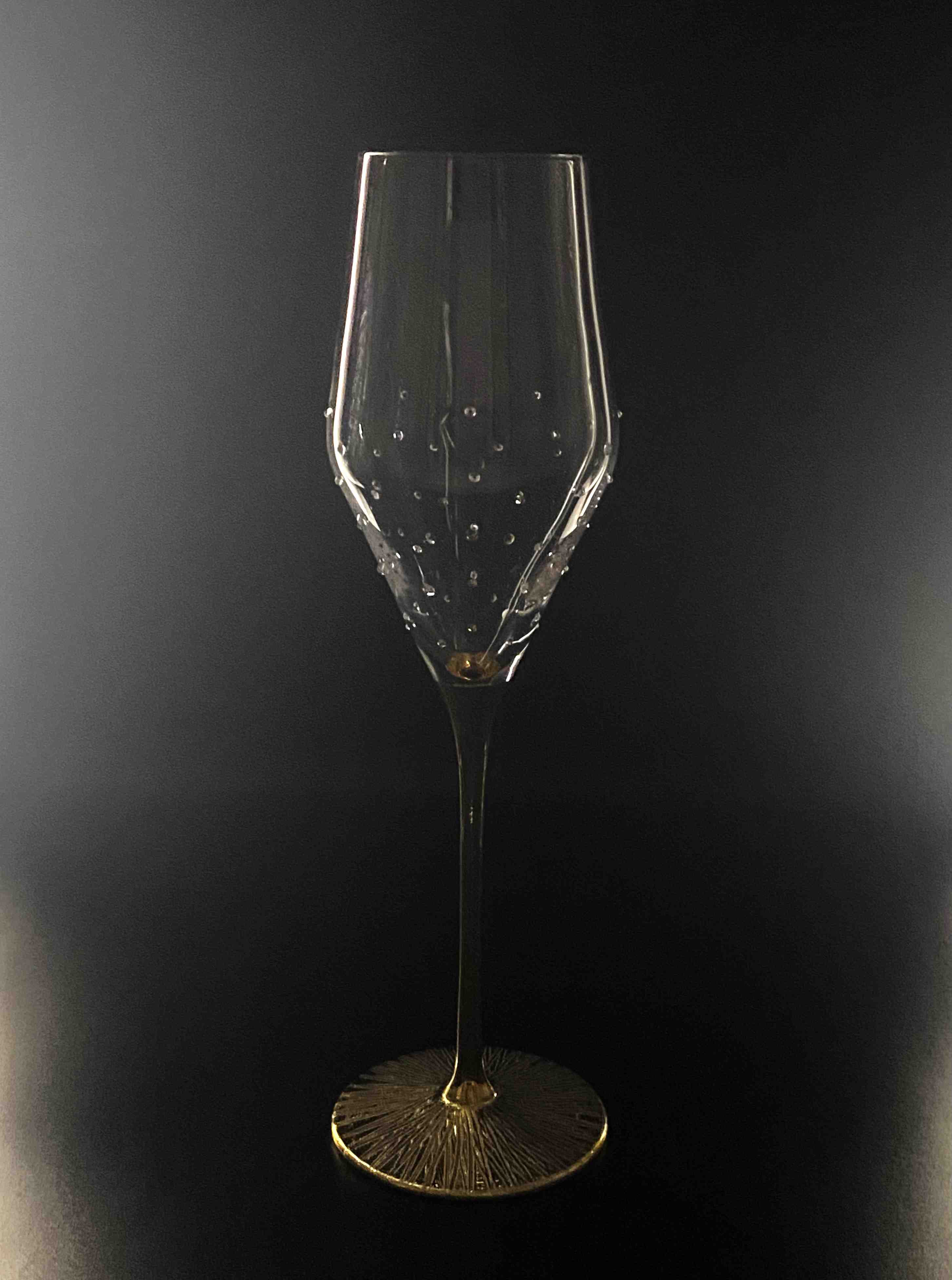 Edle Champagnerflöte RAVI Gold – ein Must-have für stilvolle Genießer. Jedes Glas ist ein handgefertigtes Unikat aus der Glashütte EISCH und veredelt mit 24-karätigem Gold sowie 60 österreichischen Strasssteinen.