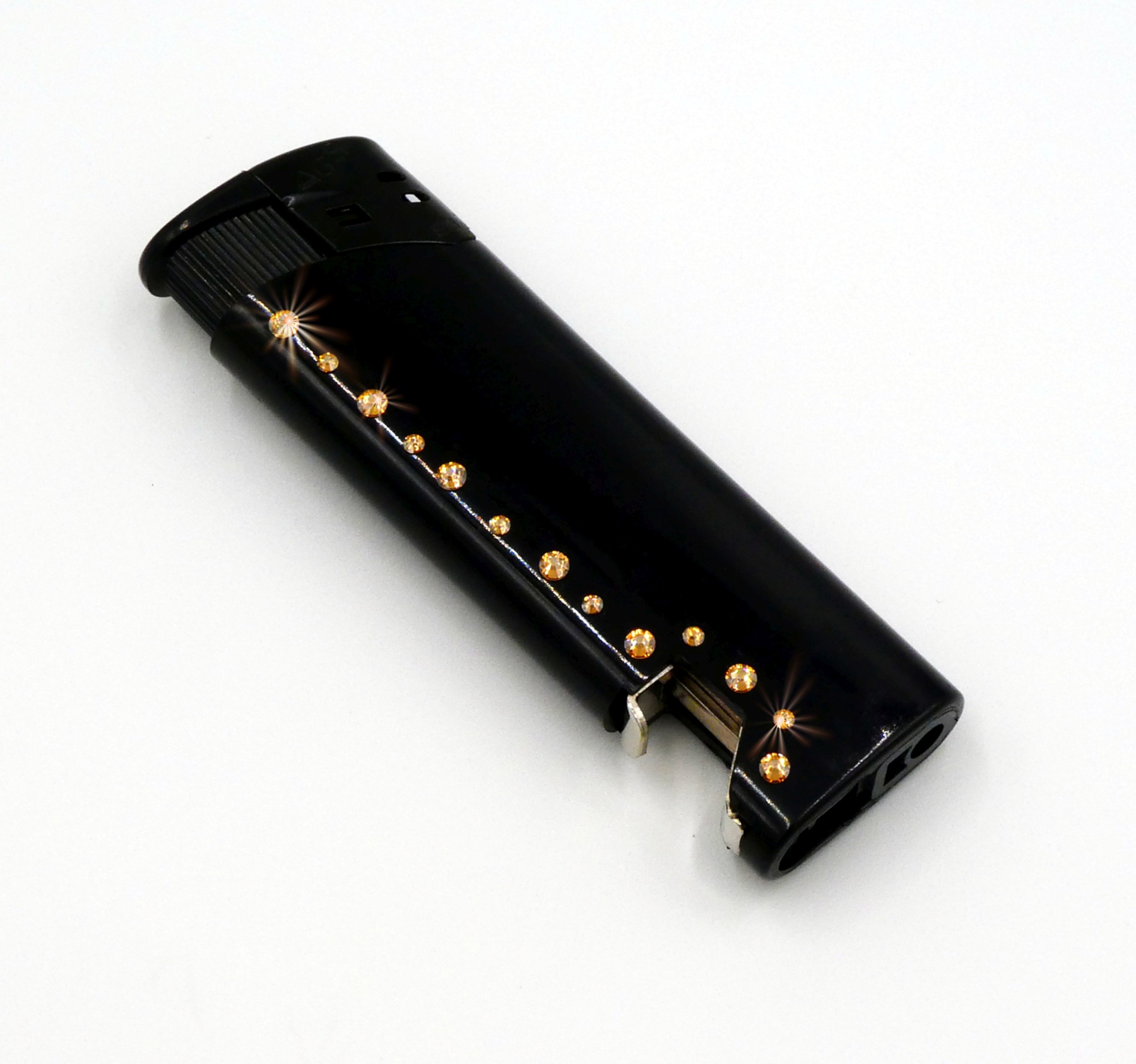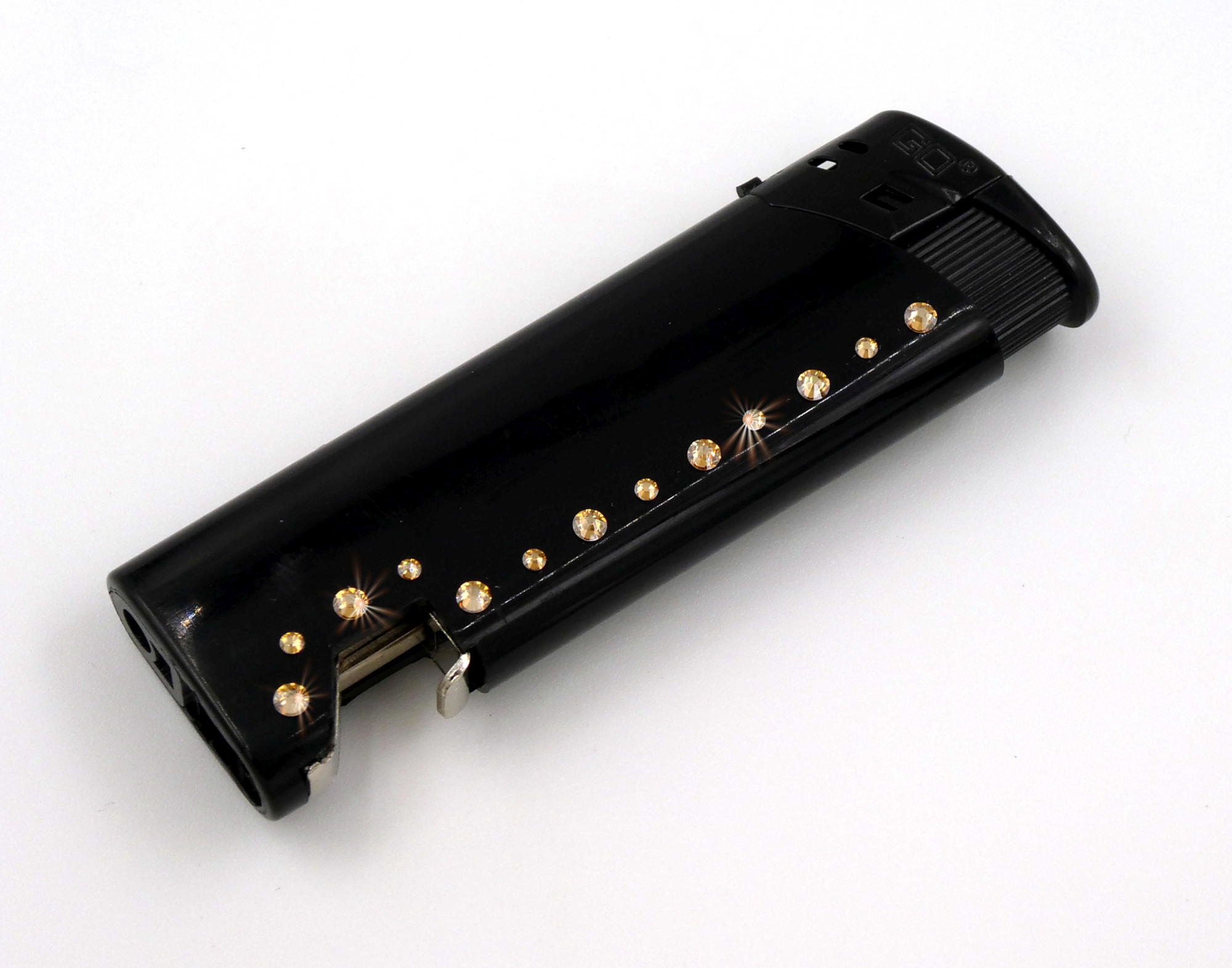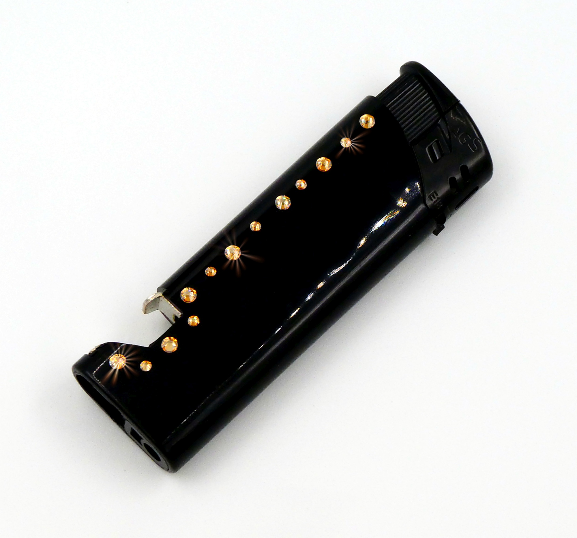 Feuerzeug mit Flaschenöffner, schwarz – veredelt mit Kristallen der Luxusklasse in der Farbe Crystal Golden Shadow