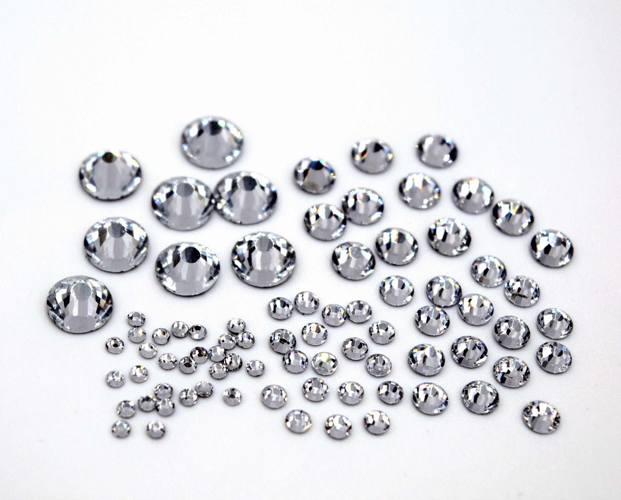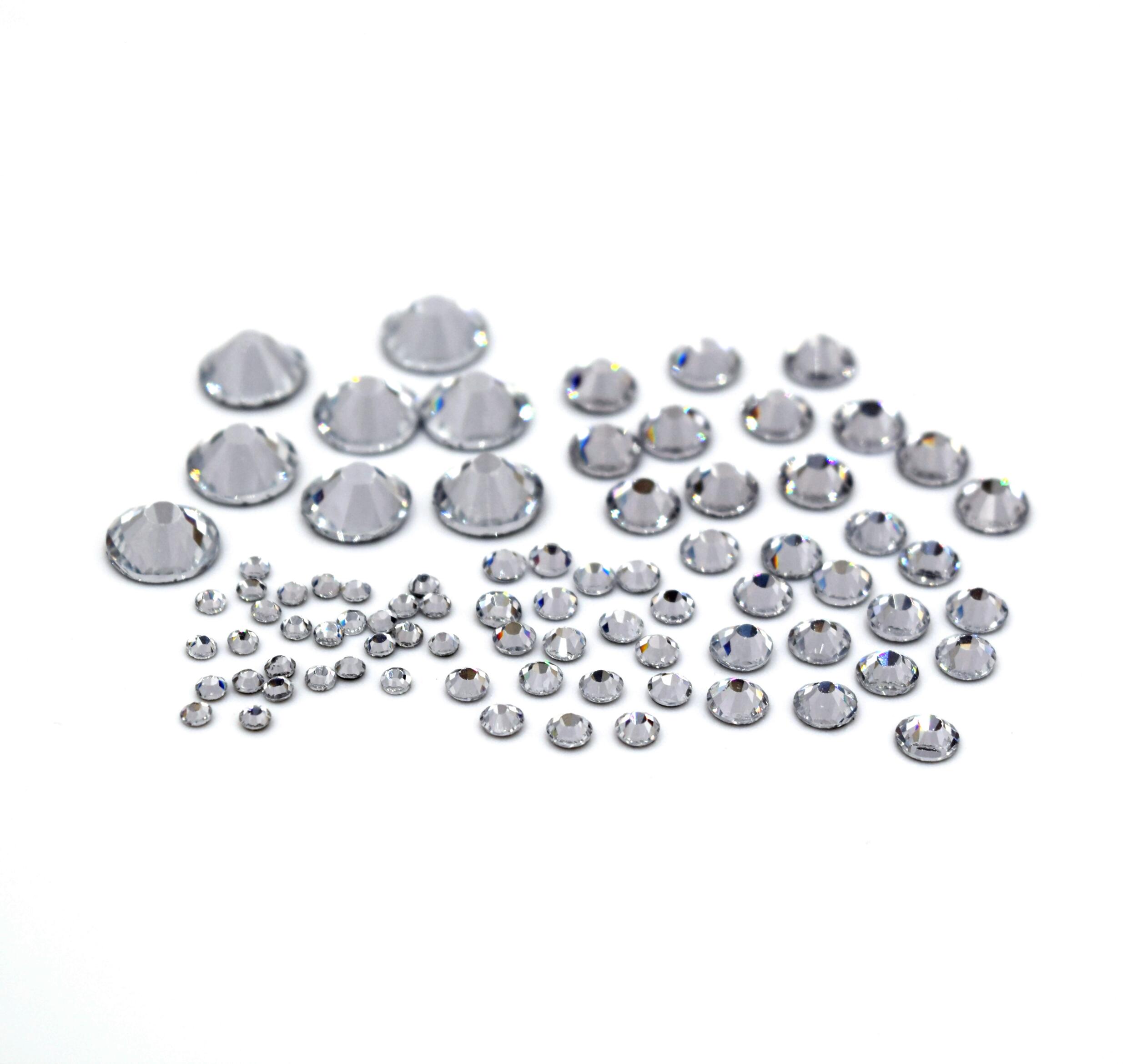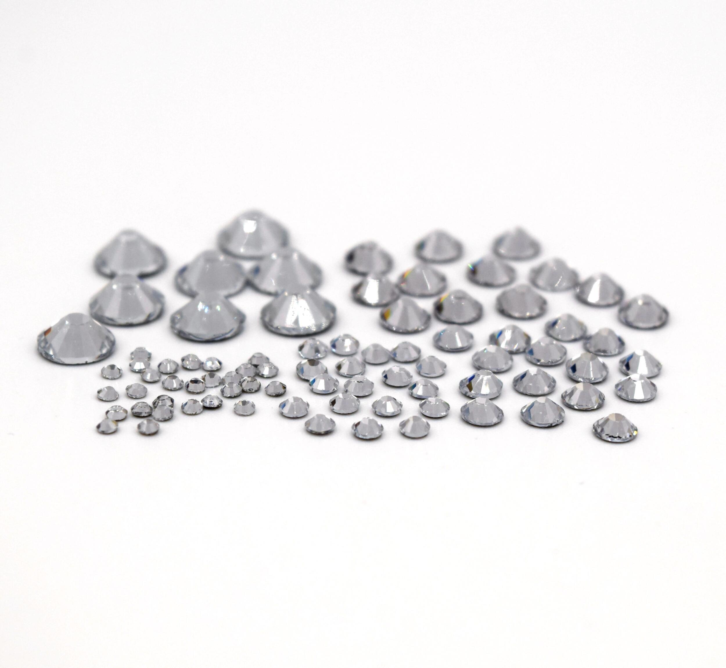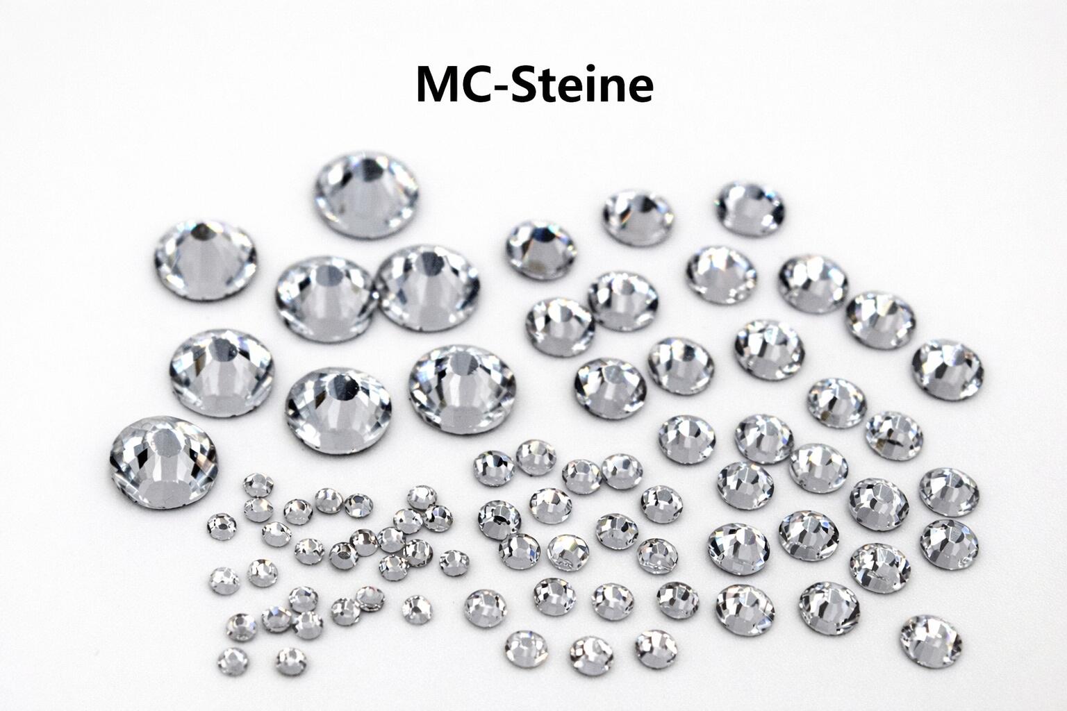 MC Steine – machine cut – maschinengeschliffene Steine mit Facetten. Dieses Paket enthält die fünf gängigsten Größen in Crystal – insgesamt 3.000 Steine!!