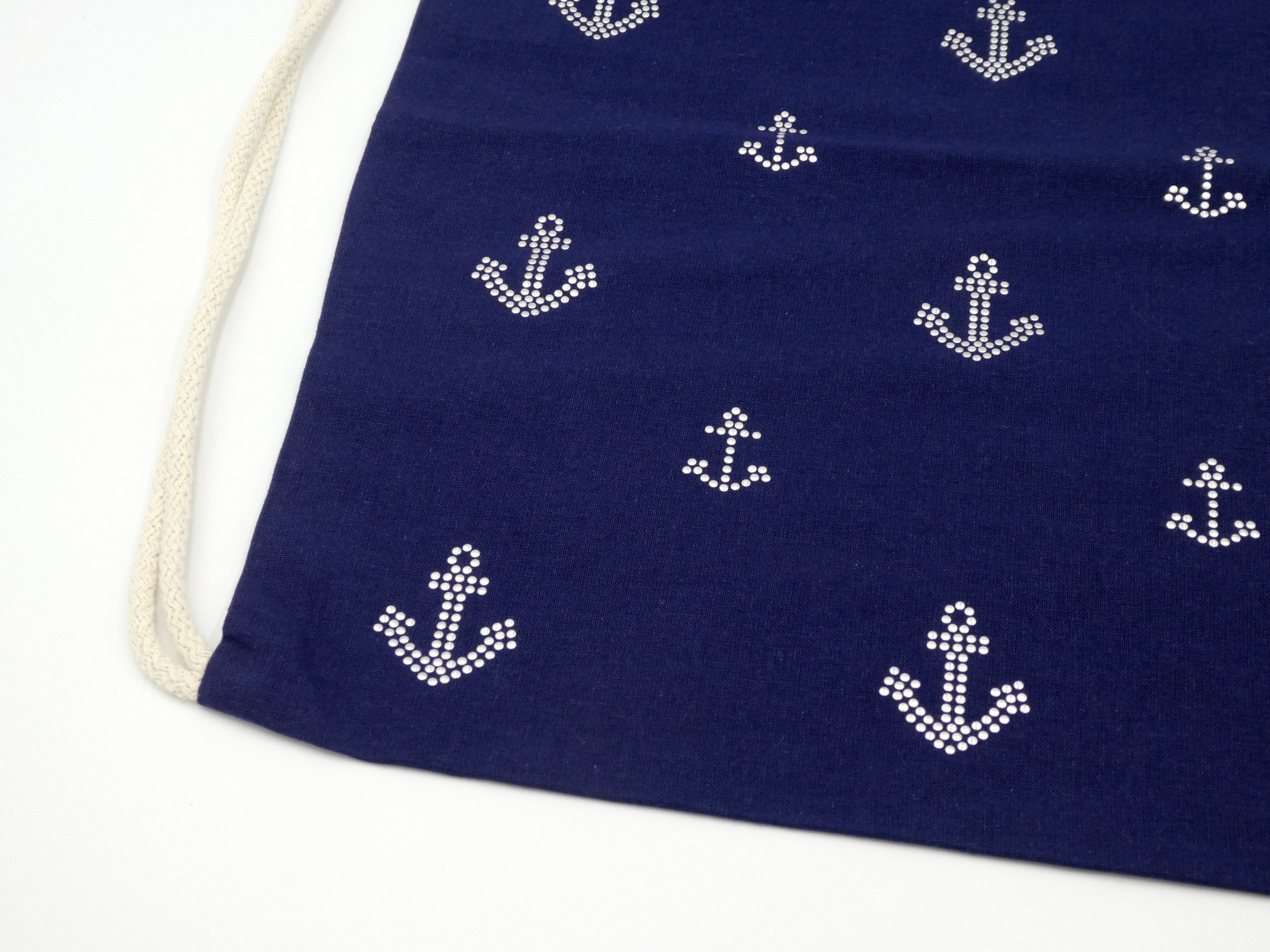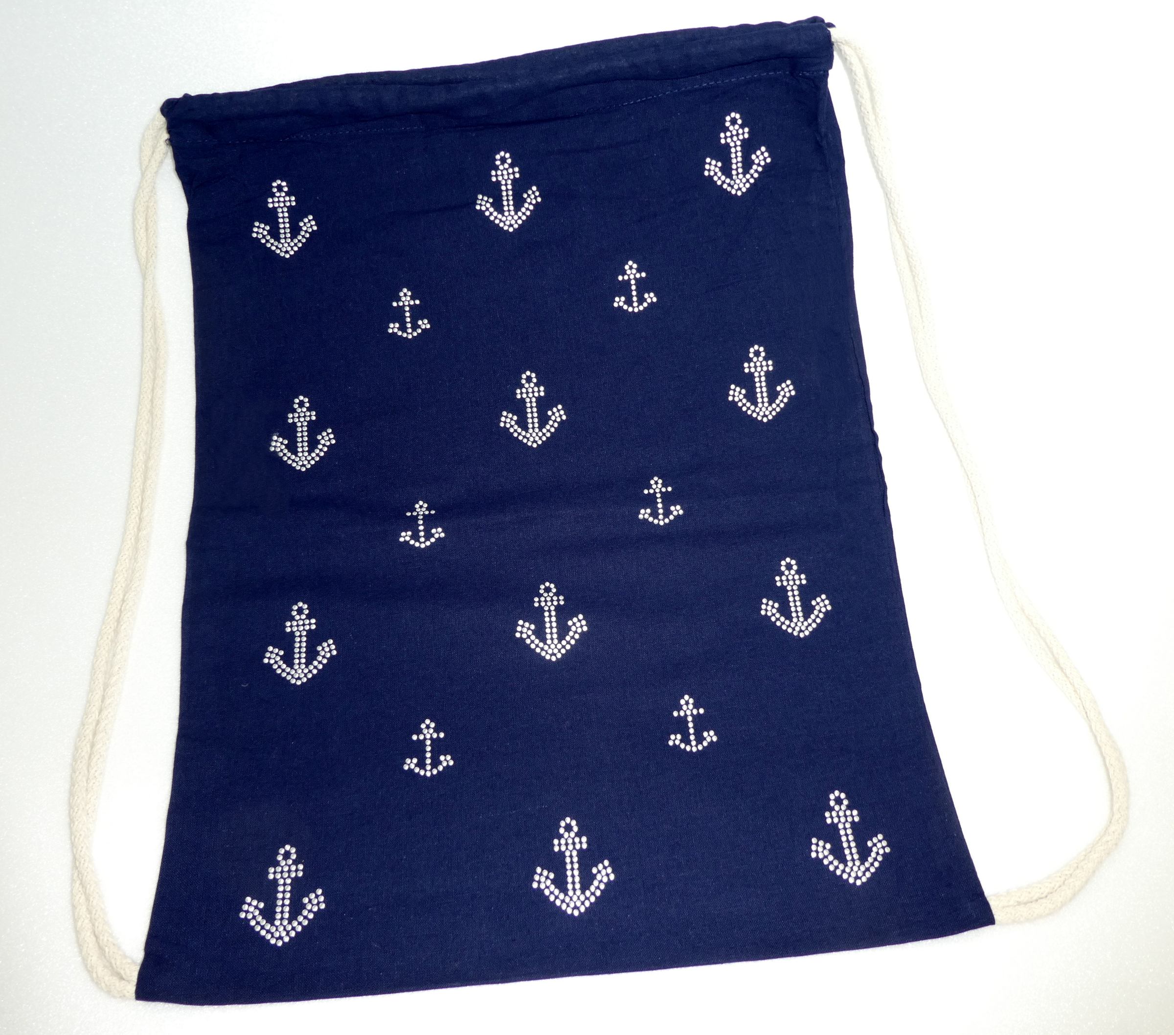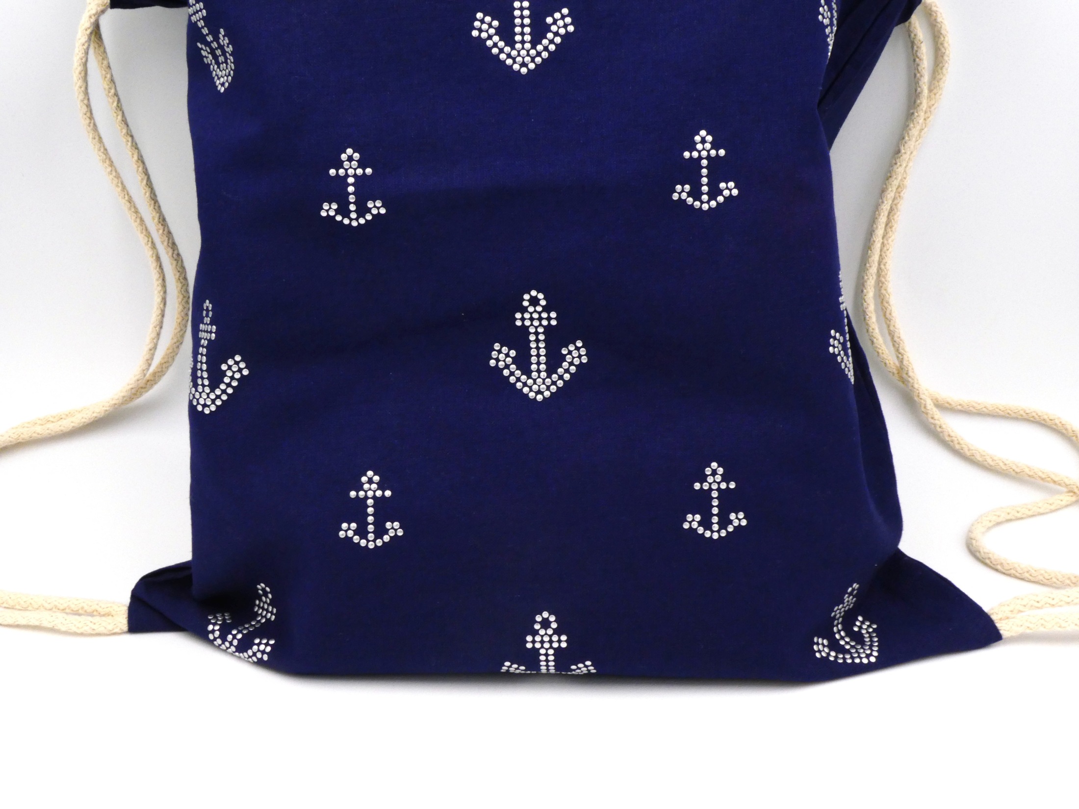 Oregon Premium Sportbeutel. Offenes Hauptfach mit Baumwoll Kordelzugverschluss. Kordeln naturfarben. 100 g/m² Baumwolle. Farbe Navy, 330 x 440 mm veredelt mit Alu Nieten