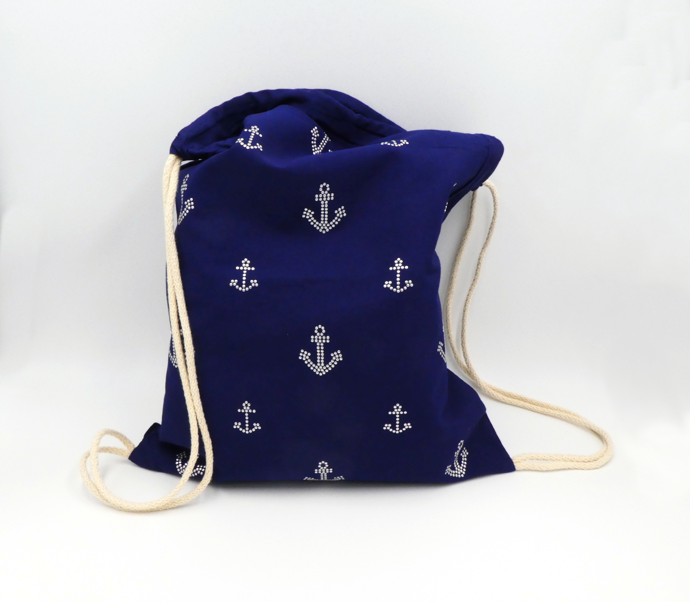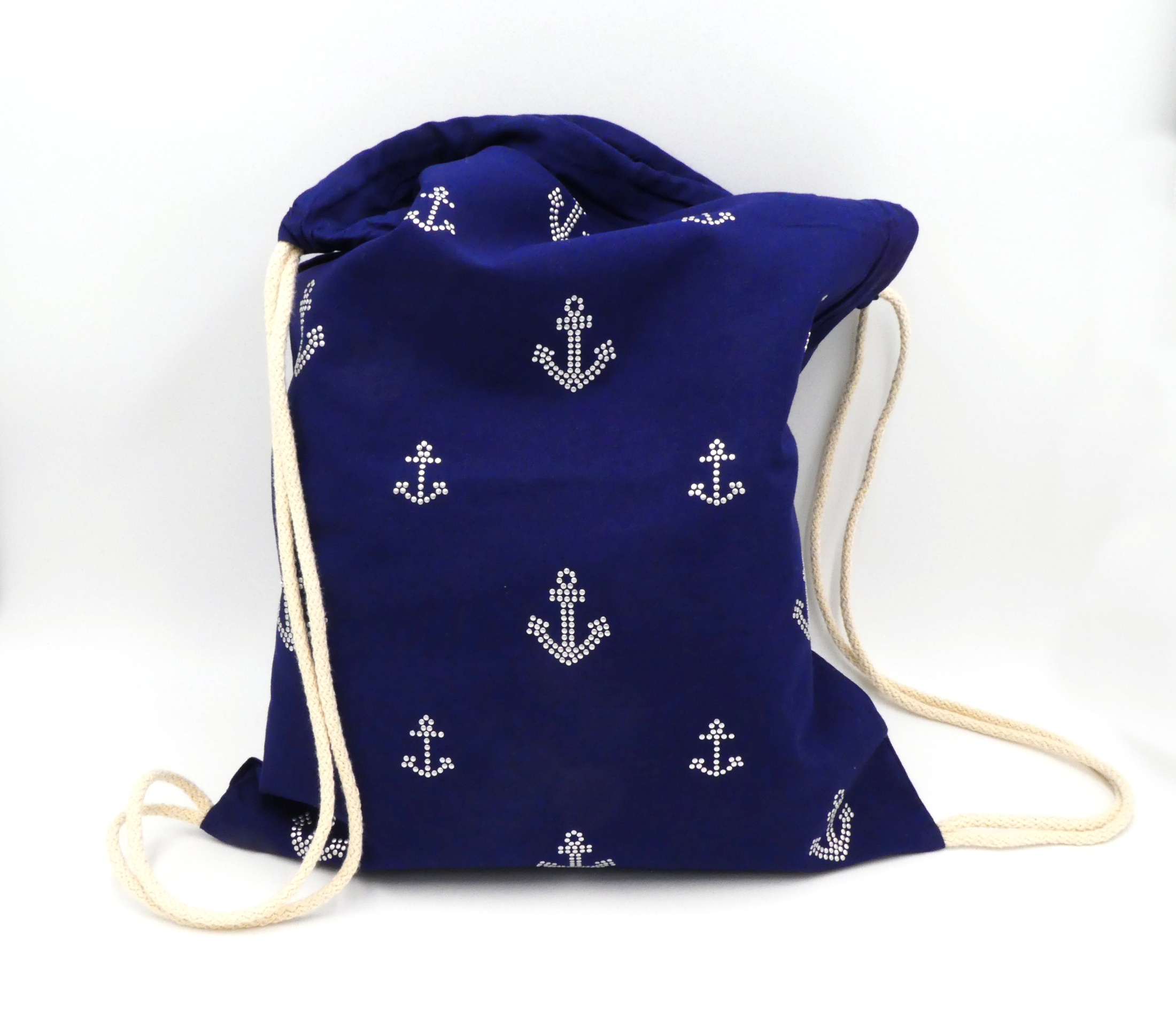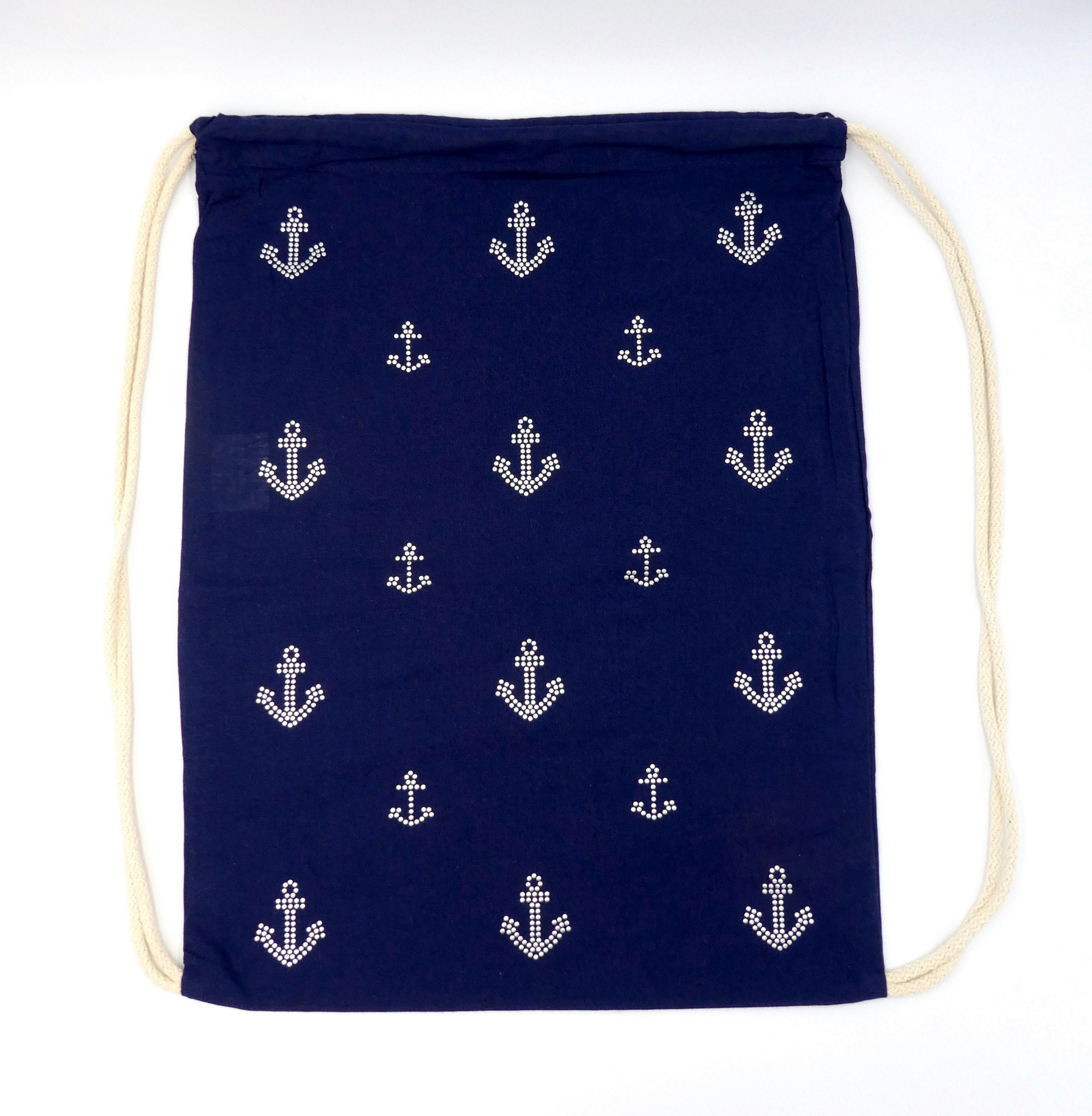 Oregon Premium Sportbeutel. Offenes Hauptfach mit Baumwoll Kordelzugverschluss. Kordeln naturfarben. 100 g/m² Baumwolle. Farbe Navy, 330 x 440 mm veredelt mit Alu Nieten