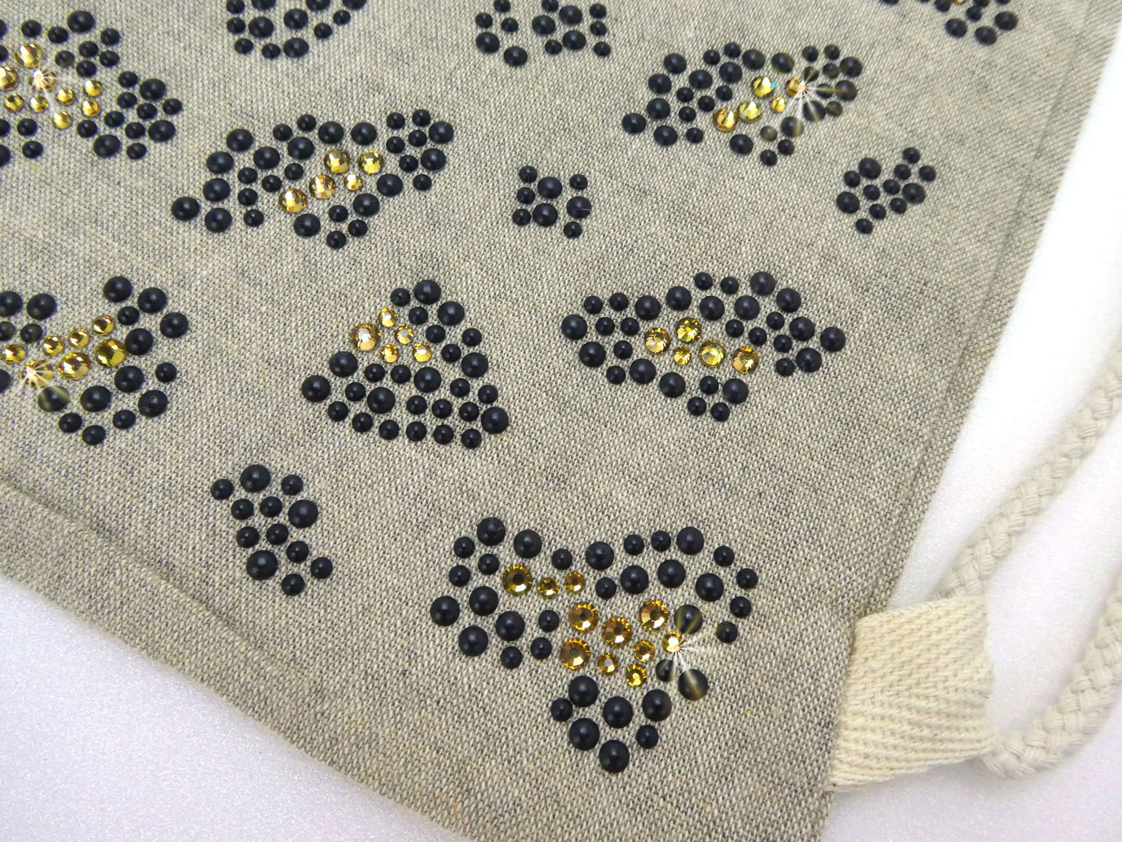 Pheebs Rucksack mit Kordelzug aus recycelter Baumwolle, 150 g/m². Recycelte Baumwolle wird aus Verbrauchsabfällen hergestellt, die während des Schneidevorgangs in Textilfabriken anfallen.  Großes Hauptfach mit Baumwollkordelzug in Naturfarbe. Entworfen für das Tragen auf der Schulter oder als Rucksack. Ausgestattet mit zwei Griffen mit einer Höhe von 14 cm. Beständigkeit bis zu 5 kg Gewicht. Es kann zu geringfügigen Farbveränderungen des eigentlichen Produkts kommen, die auf den Produktionsprozess zurückzuführen sind. 150 g/m² recycelte Baumwolle,  380 x 420 mm veredelt mit Strasssteinen und AluNieten