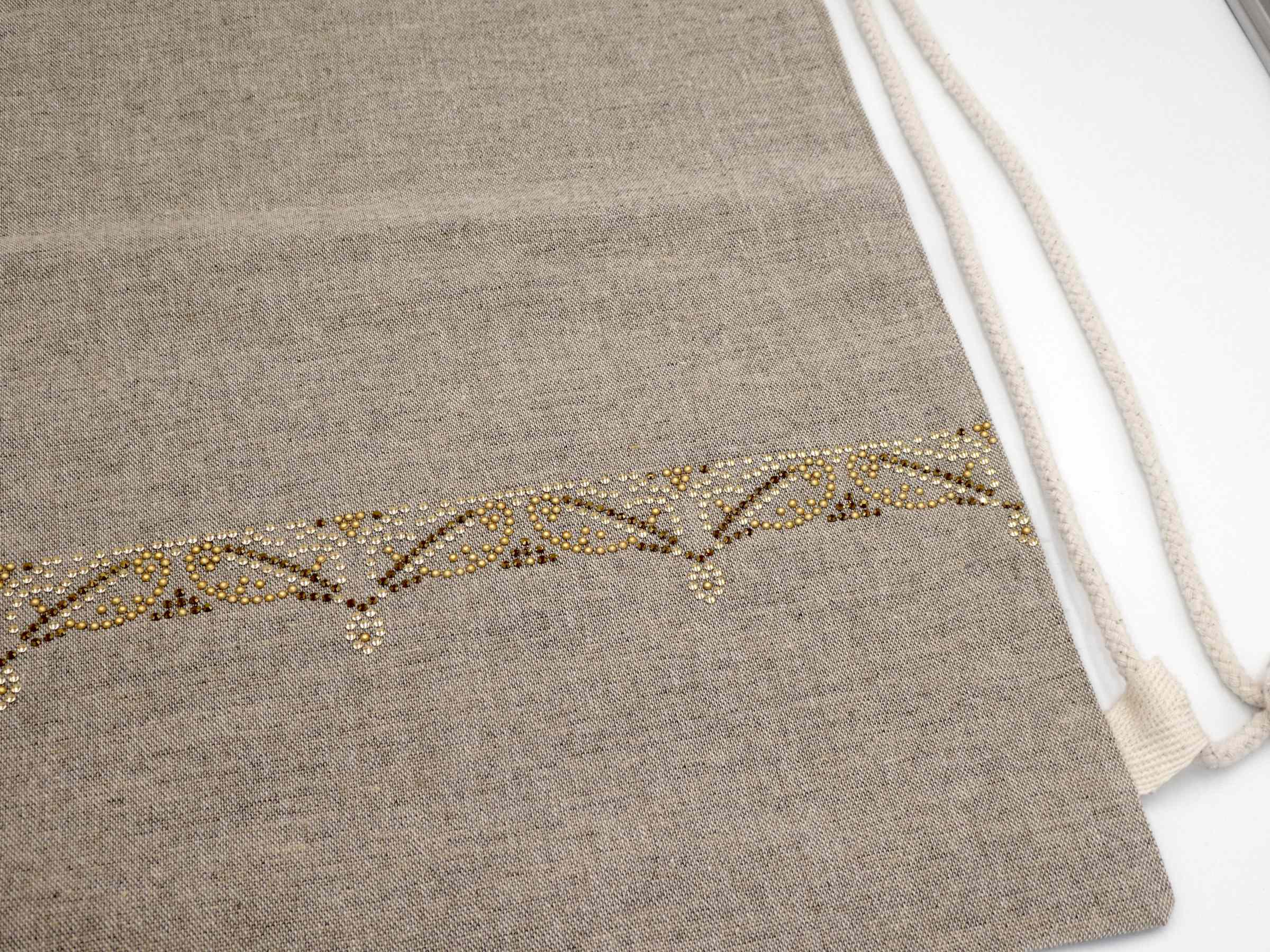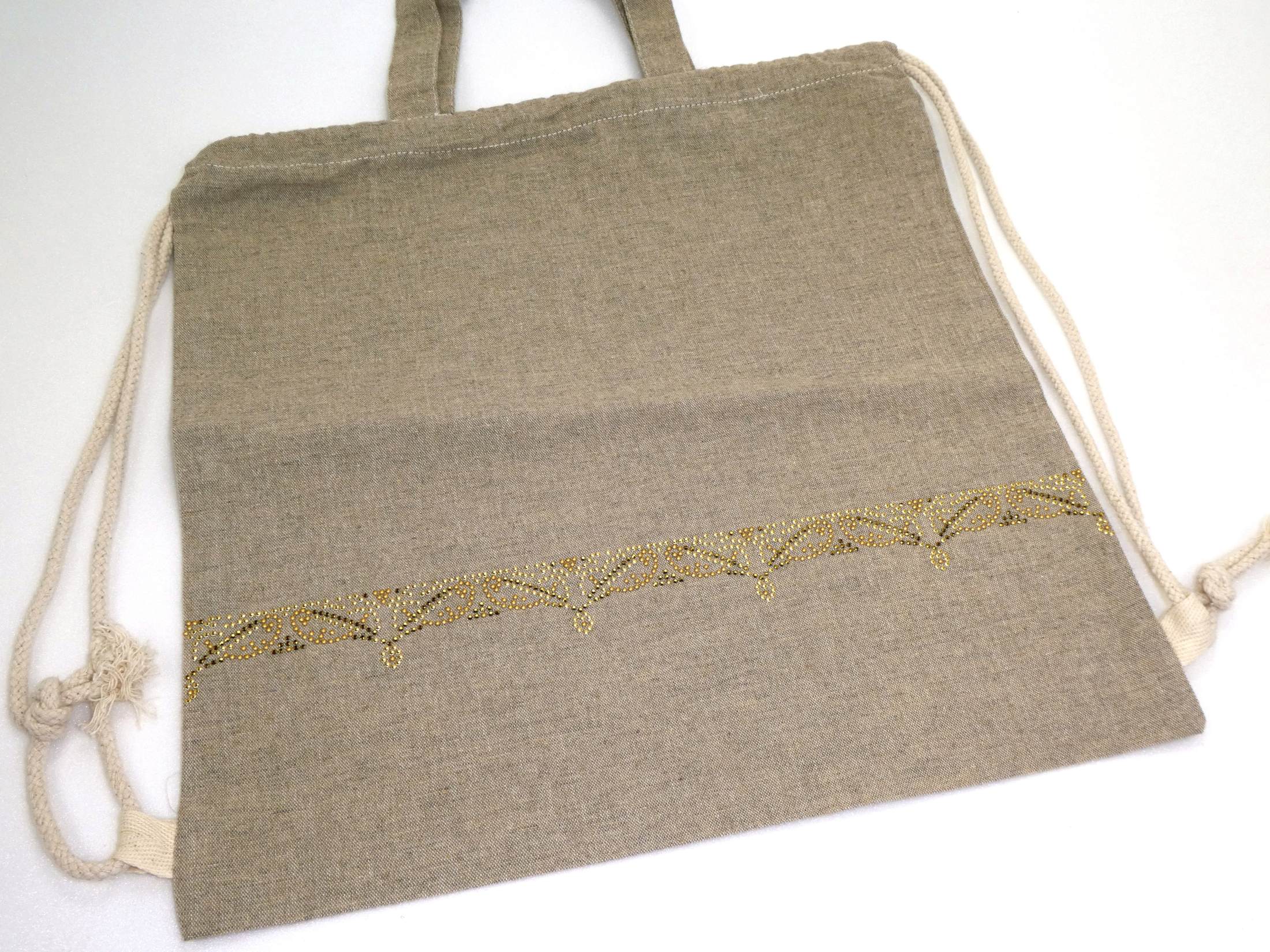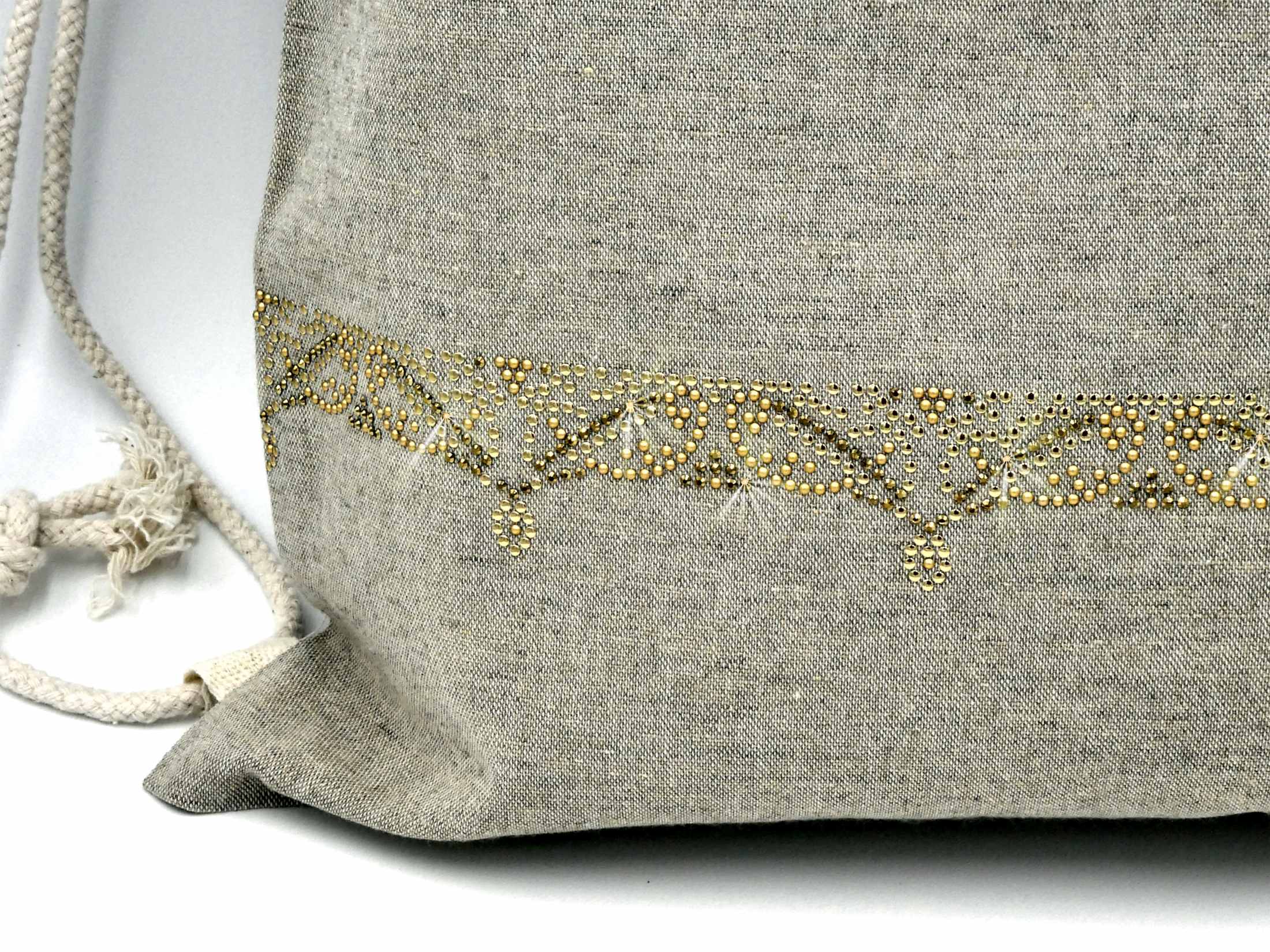 Pheebs Rucksack mit Kordelzug aus recycelter Baumwolle, 150 g/m². Recycelte Baumwolle wird aus Verbrauchsabfällen hergestellt, die während des Schneidevorgangs in Textilfabriken anfallen.  Großes Hauptfach mit Baumwollkordelzug in Naturfarbe. Entworfen für das Tragen auf der Schulter oder als Rucksack. Ausgestattet mit zwei Griffen mit einer Höhe von 14 cm. Beständigkeit bis zu 5 kg Gewicht. Es kann zu geringfügigen Farbveränderungen des eigentlichen Produkts kommen, die auf den Produktionsprozess zurückzuführen sind. 150 g/m² recycelte Baumwolle,  380 x 420 mm verdelt mit Strasssteinen und AluNieten