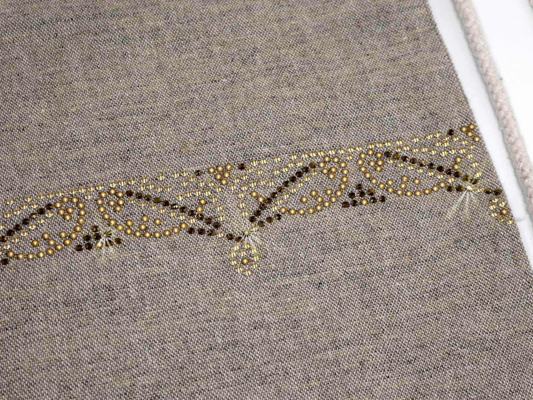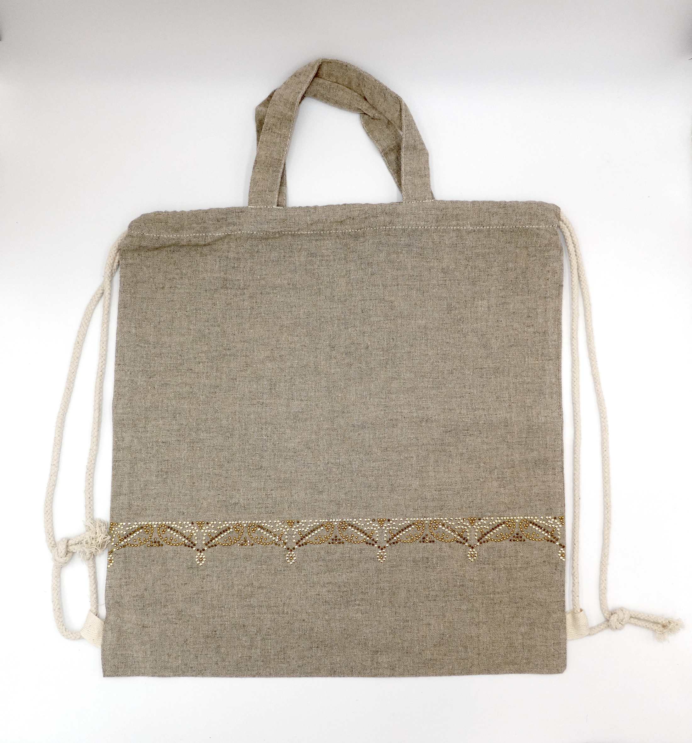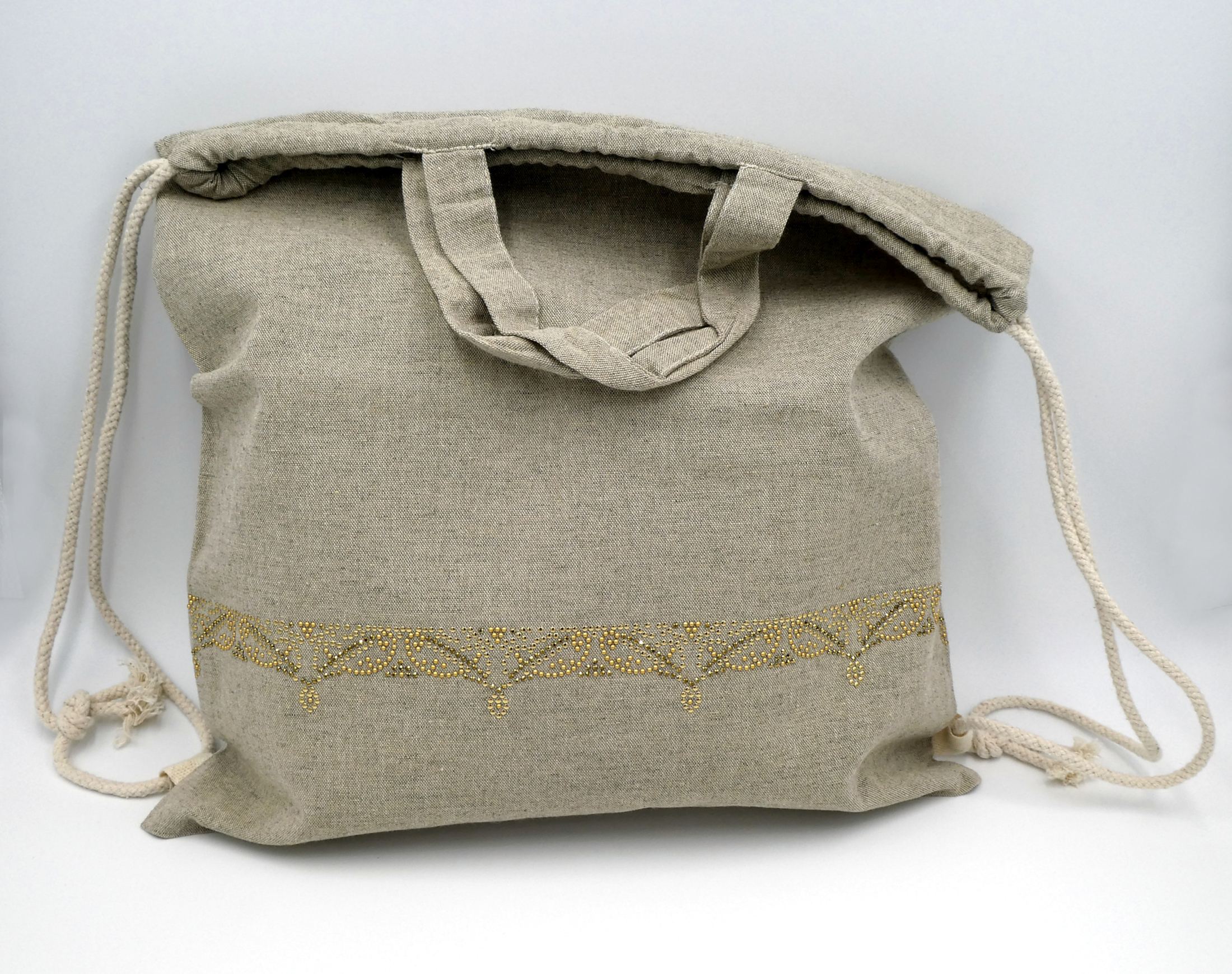 Pheebs Rucksack mit Kordelzug aus recycelter Baumwolle, 150 g/m². Recycelte Baumwolle wird aus Verbrauchsabfällen hergestellt, die während des Schneidevorgangs in Textilfabriken anfallen.  Großes Hauptfach mit Baumwollkordelzug in Naturfarbe. Entworfen für das Tragen auf der Schulter oder als Rucksack. Ausgestattet mit zwei Griffen mit einer Höhe von 14 cm. Beständigkeit bis zu 5 kg Gewicht. Es kann zu geringfügigen Farbveränderungen des eigentlichen Produkts kommen, die auf den Produktionsprozess zurückzuführen sind. 150 g/m² recycelte Baumwolle,  380 x 420 mm verdelt mit Strasssteinen und AluNieten