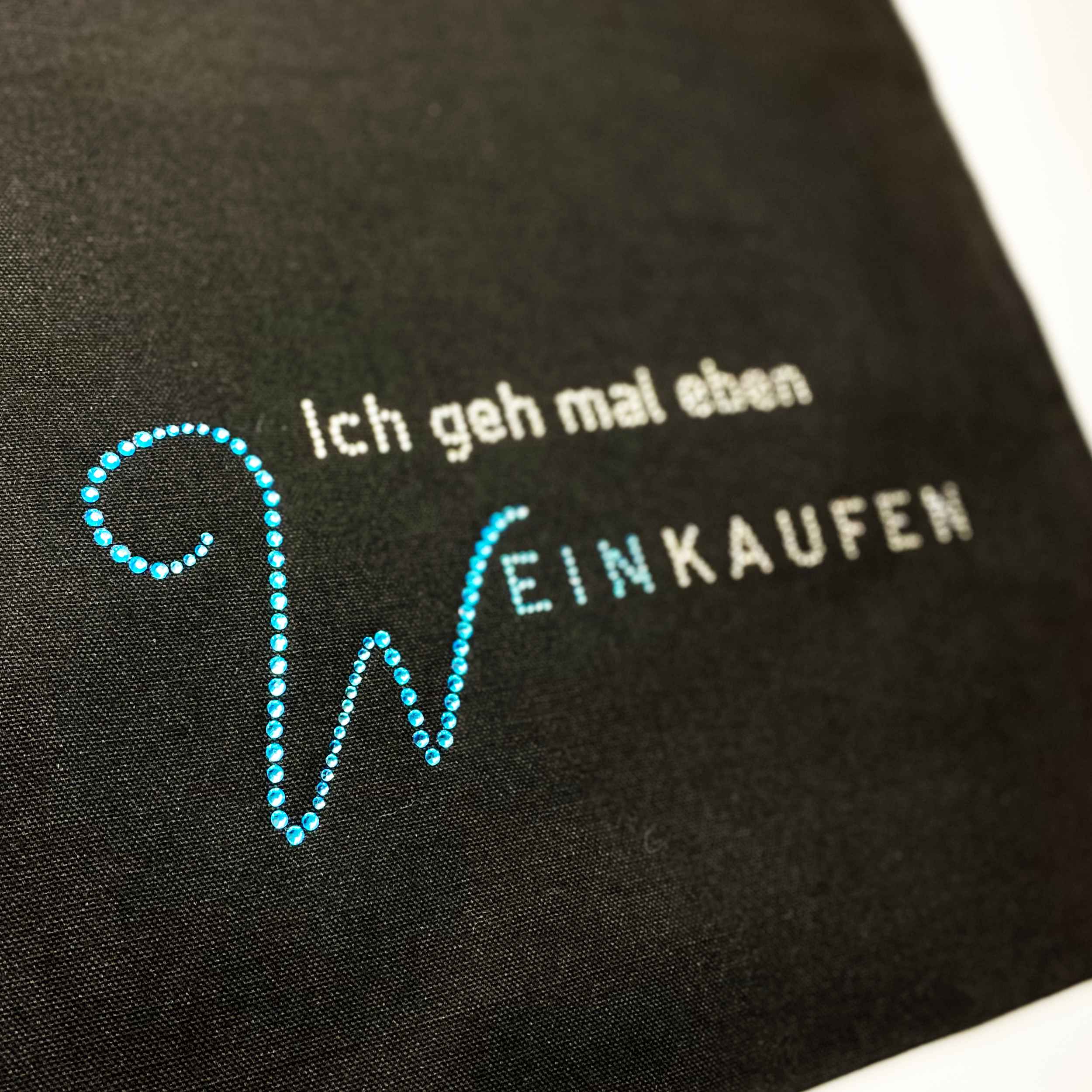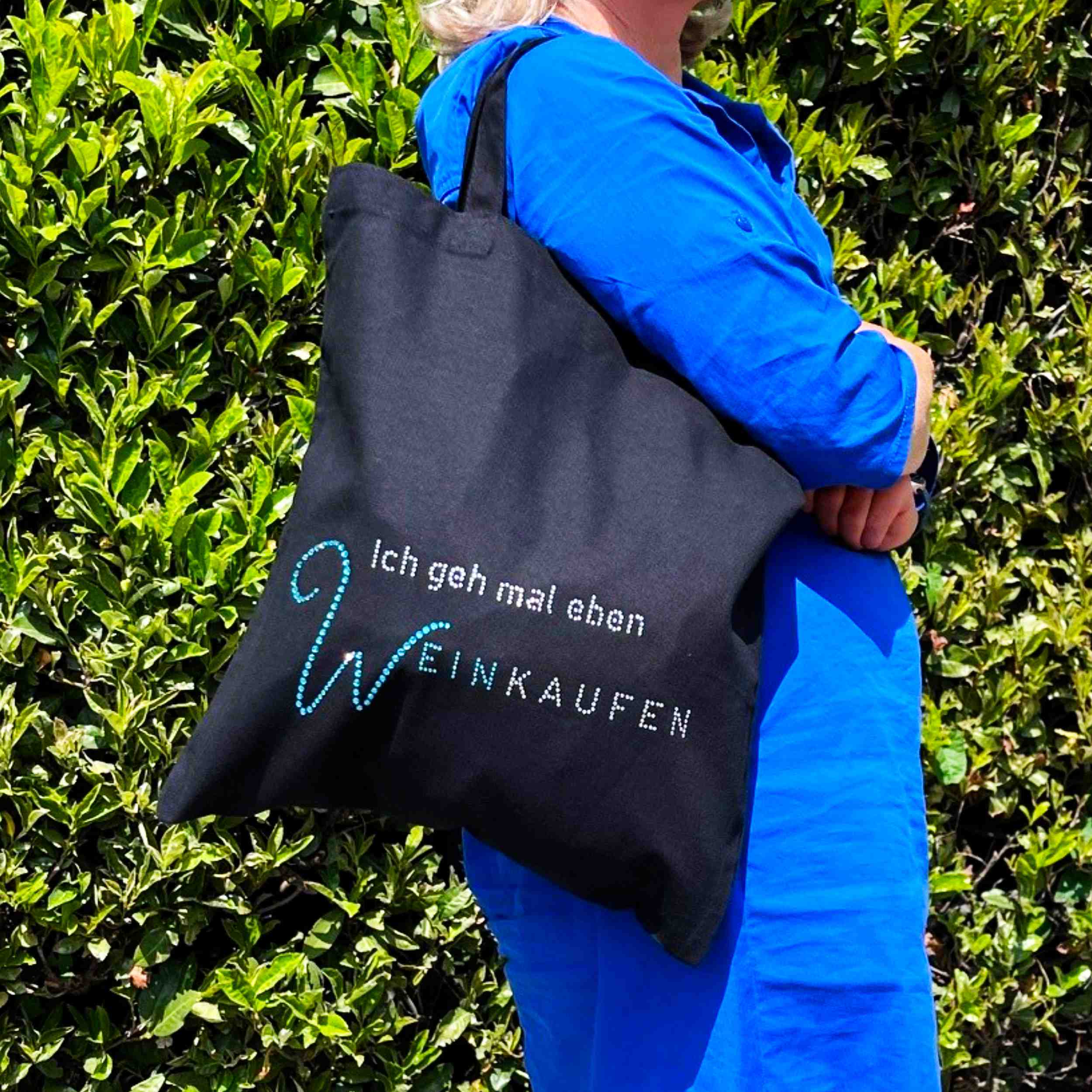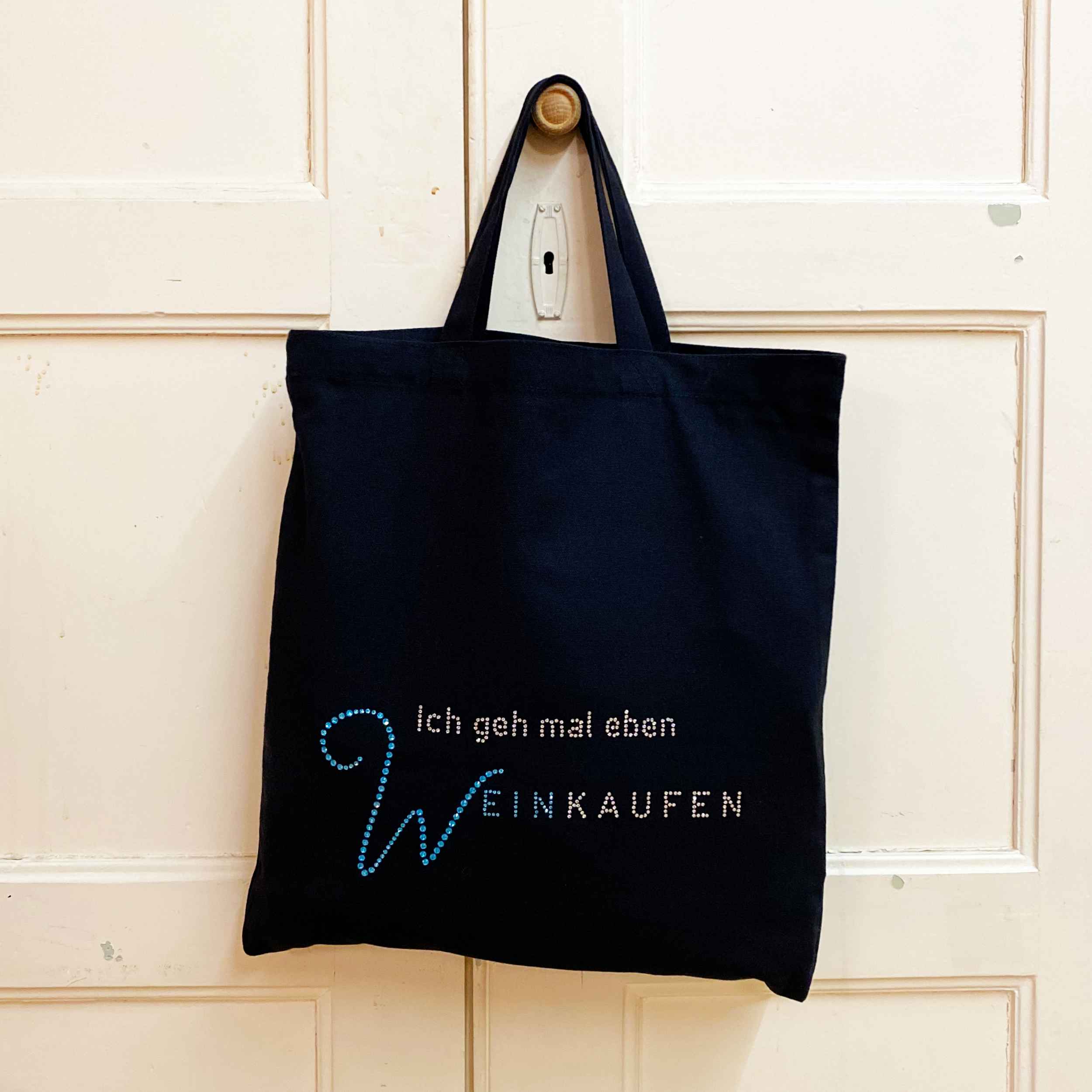 – Hochwertige Qualität aus 100 % reiner Baumwolle – Praktisch und pflegeleicht: Waschbar bei 30°C Schonwäsche – idealerweise auf links gedreht und mit ähnlichen Farben im Wäschesäckchen – Großzügige Größe von ca. 35 x 40 cm – perfekt für den Wochenendeinkauf – Individueller Auftritt mit dem charmanten Aufdruck „Ich geh mal eben Weinkaufen“ – Veredelt mit glänzenden Strasssteinen in crystal und blau – ein Hingucker beim Tragen